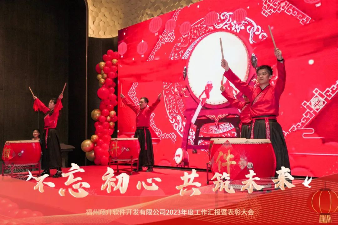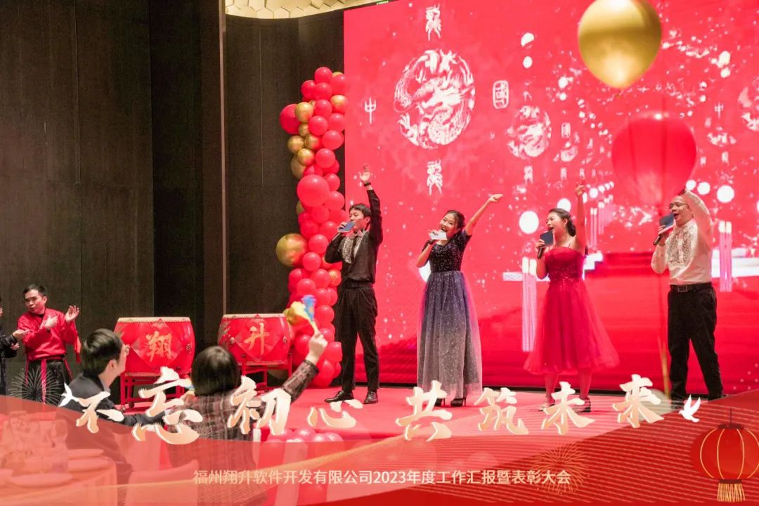 晚宴上,一曲《龙鼓盛世》中国鼓霸气开场!极具中国风的表演,瞬间点燃现场观众的热情,敲响了翔升软件2024年的好运!之后,一首大合唱《相亲相爱》仿佛带领现场的观众们走进了春晚的现场,体现了翔升团结友爱以及倡导的“家文化”。